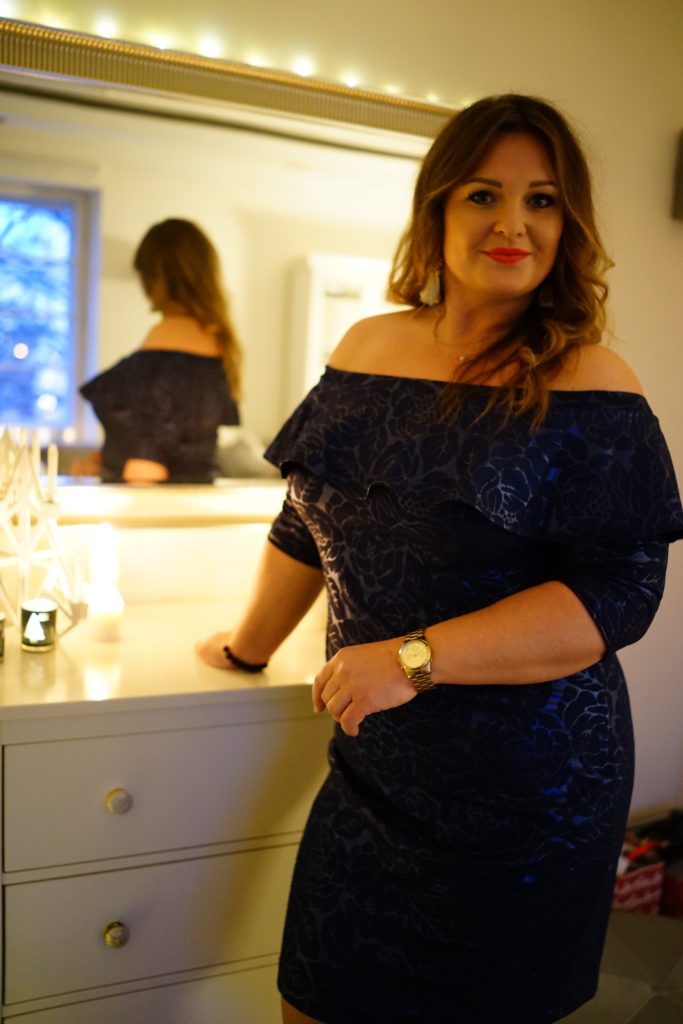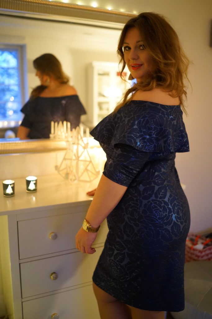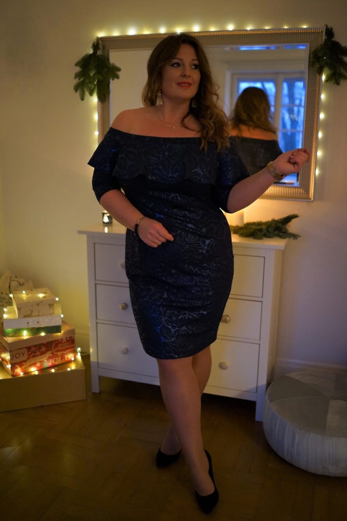 "Ten fason to był hit tego lata. Ja swoją czerwoną sukienkę pokazywałam Wam w jednym z wpisów i nosiłam bardzo często w tym sezonie. Ten model szczególnie lubię i czuję się w nim rewelacyjnie. Cieszę się bardzo, że powstała taka zimowa wersja, którą możecie spokojnie wykorzystać potem na sylwestra lub inne karnawałowe okazje. Do odkrytych ramion pasują duże ozdobne kolczyki, ja swoje kupiłam w H&M i bardzo je Wam polecam."
