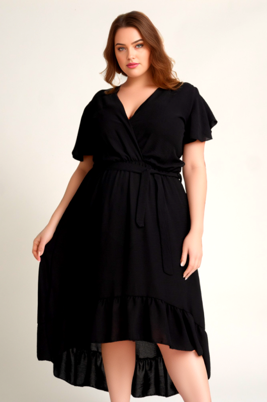 Szukasz modnej i wygodnej sukienki plus size, która sprawdzi się zarówno na co dzień, jak i na wyjątkowe okazje? Asymetryczny krój z falbankami to prawdziwy hit! Sukienka pięknie podkreśla talię, a kopertowy dekolt dodaje kobiecego wdzięku.