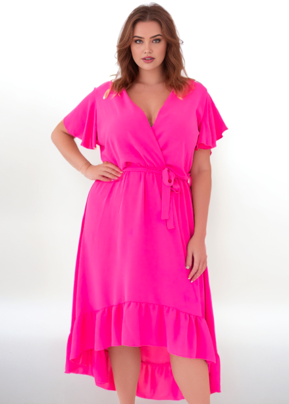 Szukasz modnej i wygodnej sukienki plus size, która sprawdzi się zarówno na co dzień, jak i na wyjątkowe okazje? Asymetryczny krój z falbankami to prawdziwy hit! Sukienka pięknie podkreśla talię, a kopertowy dekolt dodaje kobiecego wdzięku.