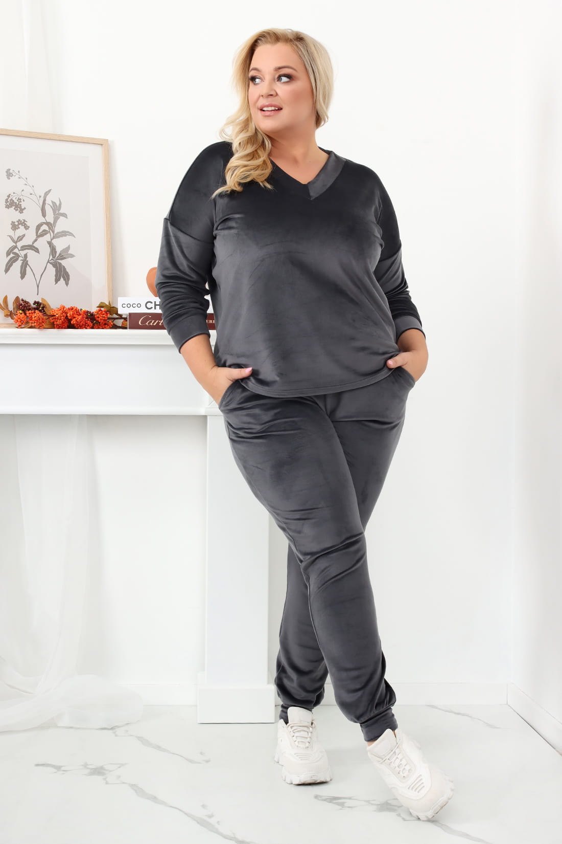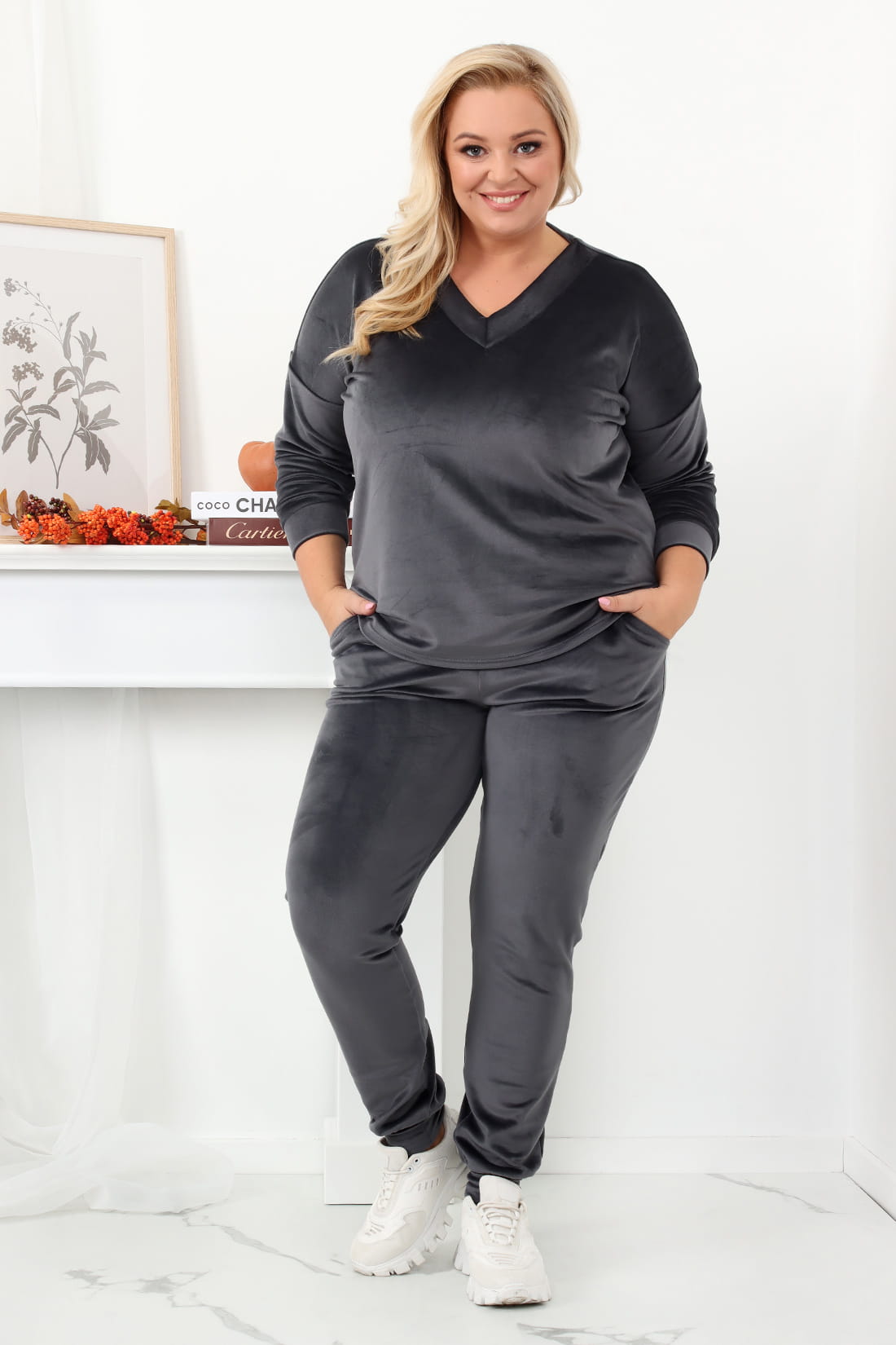 Nasza kolejna propozycja to komplet dresowy plus size NAOMI. Komplet dresowy dla puszystych sprzedawany w czterech wersjach kolorystycznych. Spodnie dla puszystych posiadają gumę w pasie. Wykonany z bardzo miłego i przyjemnego w dotyku welurowego materiału, dzięki czemu z pewnością można się w nim czuć komfortowo, wygodnie i stylowo. Dekolt w szpic dodaje lekkości sylwetce. Można zestawić go z innymi, ulubionymi częściami swojej garderoby. Jest to część garderoby must have! Model wyprodukowany w Polsce z dbałości o każdy detal.