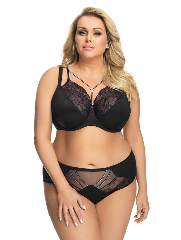 Zmysłowe, czarne figi o wyższym kroju z nowej linii Glossy, od Gorseni. Piękny, fascynujący model. Przód z lekkim prześwitem i ozdobnymi, srebrzystymi paskami, z wdziękiem wykończony koronką. Tył z delikatną, koronkową wstawką w górnej części. Skład: 90% poliamid, 7% elastan, 3% poliester.