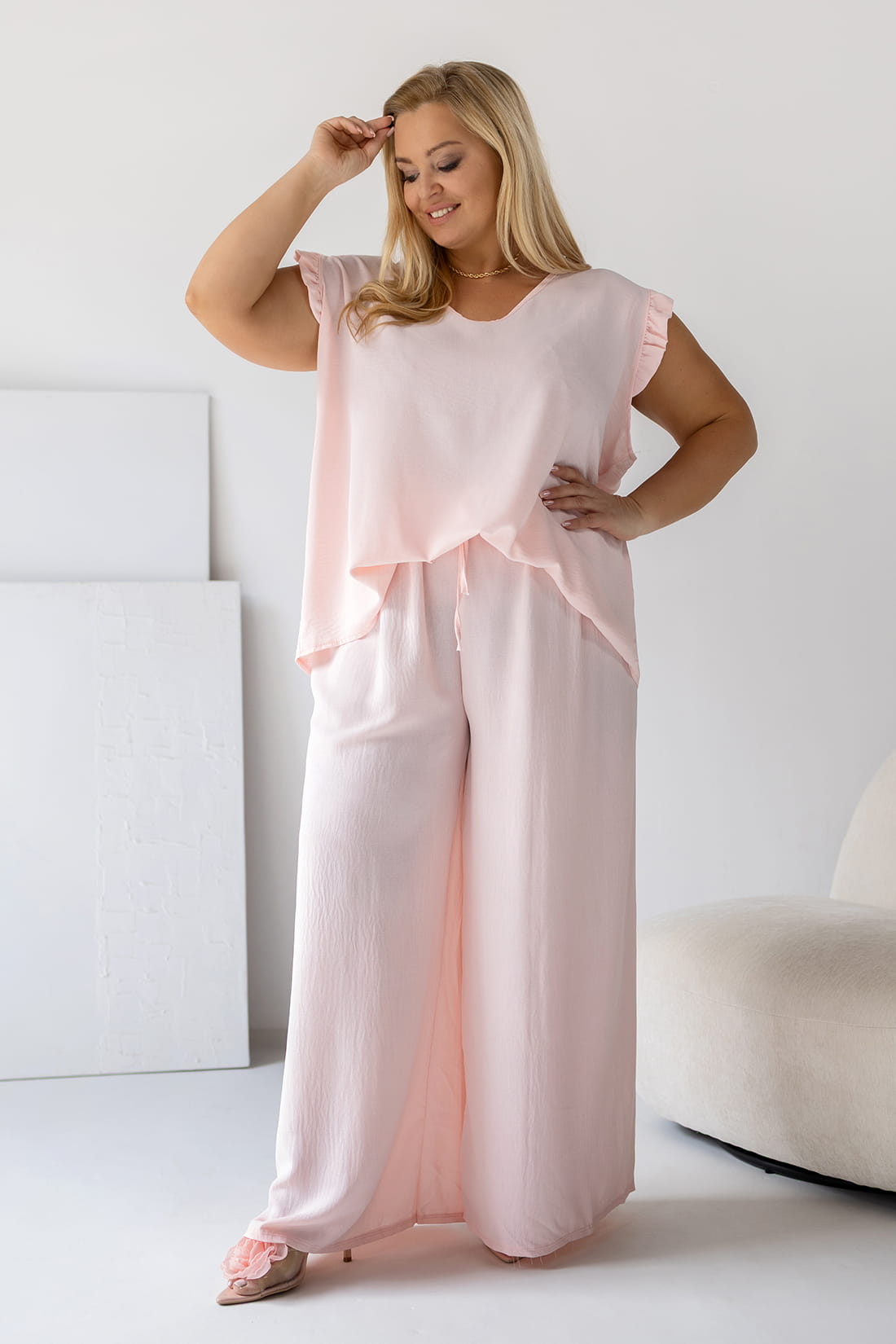 Zwiewny komplet plus size – szerokie spodnie i luźna tunika z falbanką