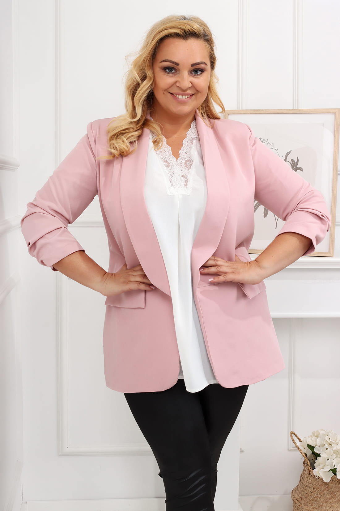 Klasyczna marynarka plus size, idealną dla puszystych kobiet w dużych rozmiarach. Marynarka w tym modelu została stworzona, aby podkreślić Twoją elegancję i styl, zapewniając doskonałe dopasowanie i wygodę. Niech stanie się ona nieodłącznym elementem Twojej garderoby, dodając profesjonalnego wyglądu i pewności siebie!