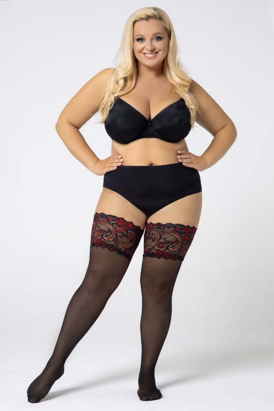- Elegancka, czarno-czerwona koronka nie tylko pięknie wygląda, ale także zapewnia komfort noszenia, nie uciskając nóg.