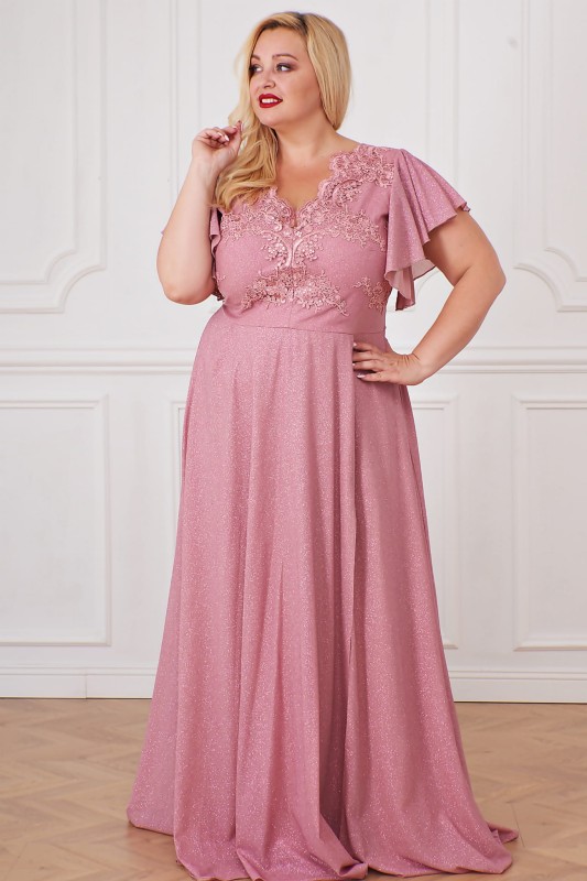 CHARLOTTE brocate to zjawiskowa długa suknia plus size z brokatowego szyfonu. Góra sukni uszyta z wyjątkowej gipiury ozdobionej drobnymi cekinkami. Rękaw falbanka bardzo komfortowy w noszeniu. Suknię wykonano z najwyższej jakości tkanin oraz gipiur z elastanem. Suknia dla puszystych w tym modelu z podszewką oraz rozcięciem na nodze. Model wysmuklający, zaprojektowany z myślą dla sylwetek PLUS SIZE. Sukienka posiada zwiewną podszewkę.