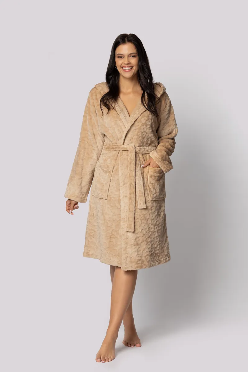 Stylowy, wygodny i ciepły szlafrok, idealny do otulenia się po kąpieli lub na chłodne wieczory. Wykonany z puszystego, miękkiego materiału flannel fleece, który doskonale ogrzewa i zapewnia komfort noszenia. Damski szlafrok w ciepłym odcieniu beżu z wytłoczonym wzorem zwierzęcych cętek.