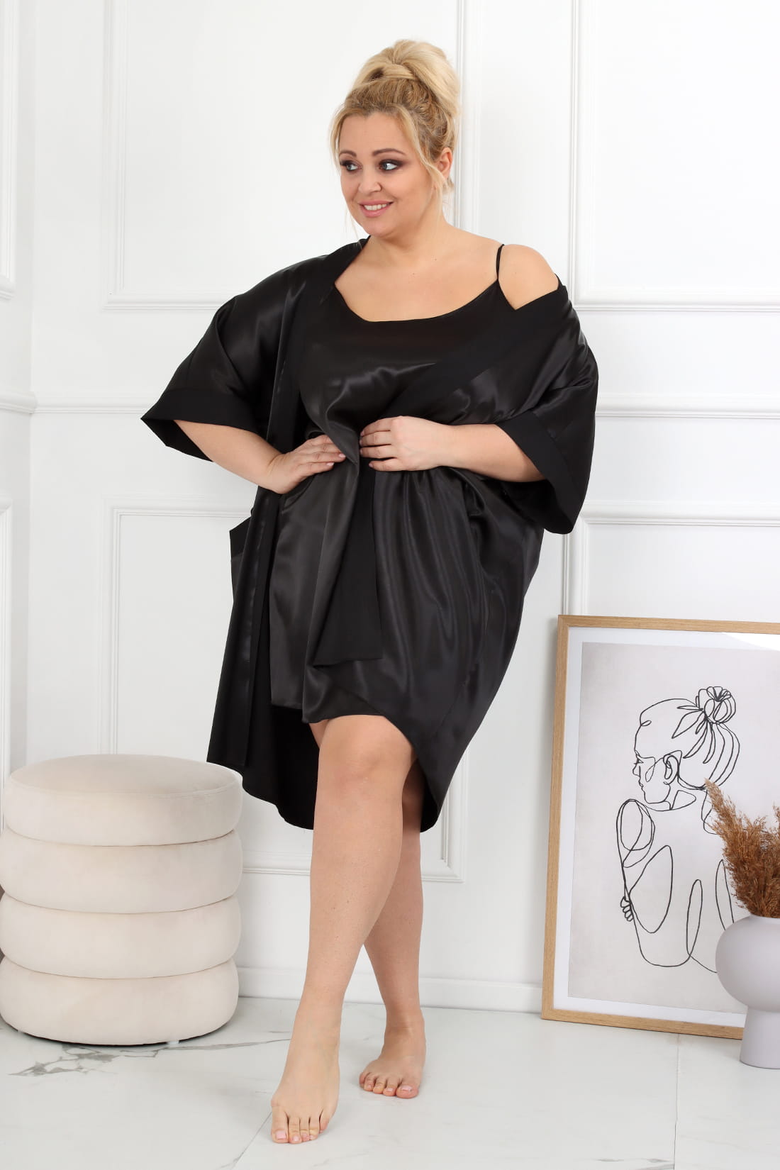 Satynowy szlafrok plus size o luźnym swobodnym fasonie z paskiem do wiązania.