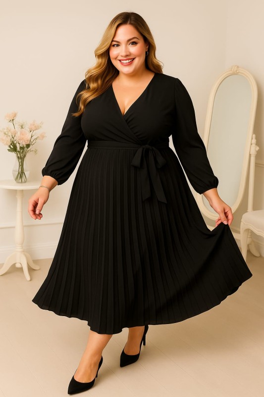 Elegancka, kobieca sukienka plisowana z kopertowym dekoltem, idealna dla sylwetek plus size. Góra z zakładanym dekoltem pięknie podkreśla biust, a pasek w talii pozwala dopasować szerokość i zaznaczyć wcięcie. Dół z drobnymi plisami miękko otula biodra i nogi, nadając całej stylizacji lekkości. Długie rękawy dodają klasy, dzięki czemu sukienka świetnie sprawdzi się na uroczystości rodzinne, święta, randkę czy wyjście do pracy. Dostępna w kilku modnych, ponadczasowych kolorach – wybierz ten, w którym czujesz się najlepiej.