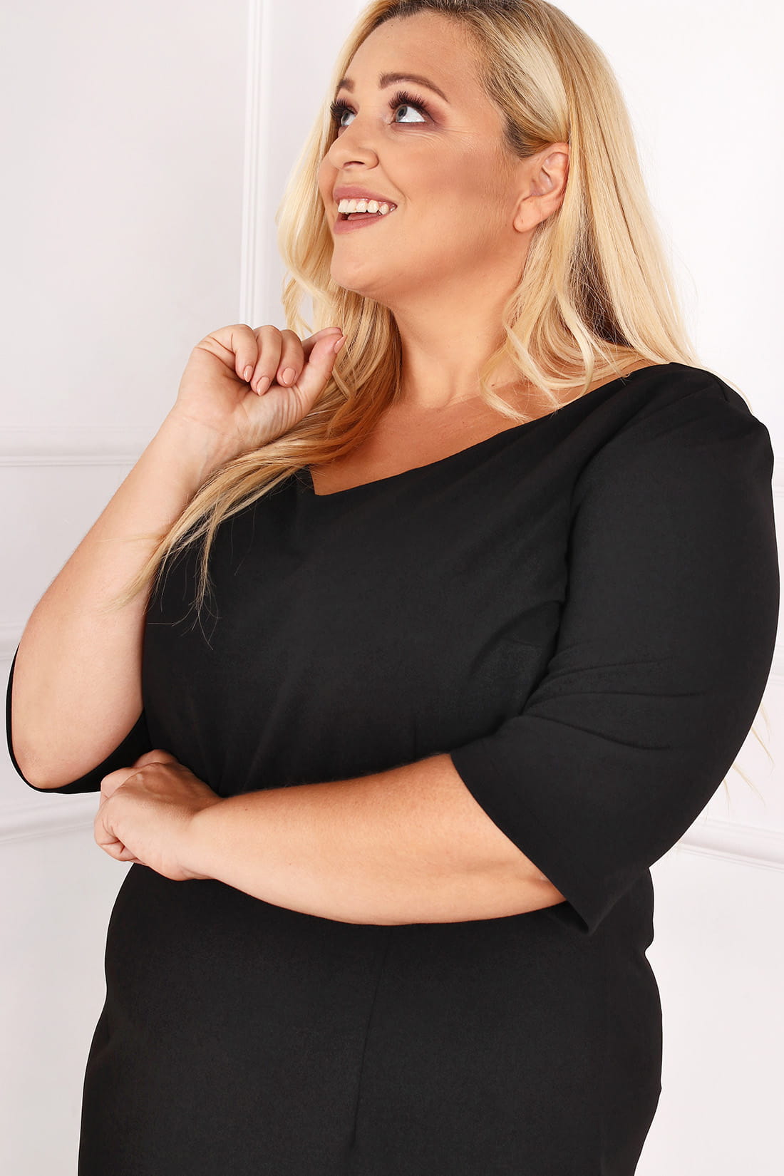 Klasyczna sukienka plus size z lekko elastycznego materiału. Mała czarna, która powinna znaleźć się w każdej szafie. Delikatny dekolt V, rękaw 3/4. Sukienka w zależności od dodatków świetnie się sprawdzi na wiele okoliczności i będzie odpowiednia na każdą okazję.