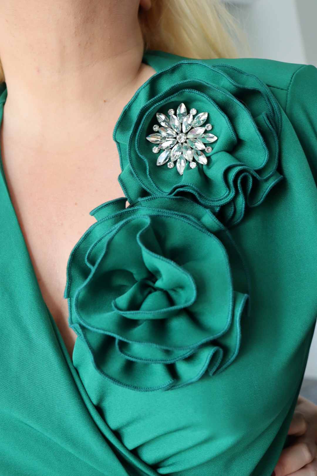 W zestawie znajdują się dwie ręcznie szyte róże oraz biżuteryjna broszka. Możesz dowolnie zmieniać charakter stylizacji – od romantycznego looku po minimalistyczną elegancję.