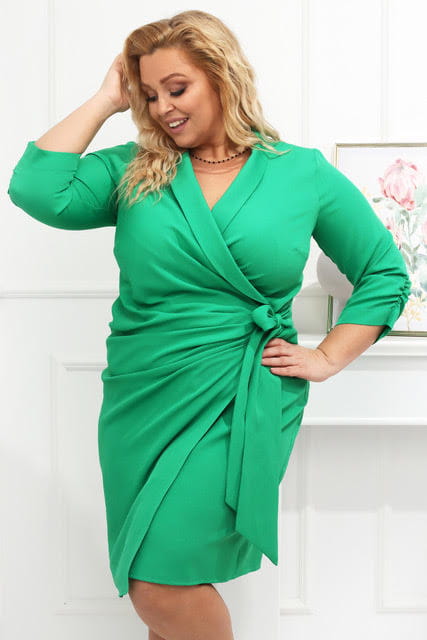 Doskonała sukienka plus size o wiązanym kroju tzw. "fason szlafrokowy" - możesz dzięki temu regulować rozmiar sukienki i odpowiednio dopasowaeć ją do swoich kragłości. Sukienka została uszyta z lekko elastycznego materiału.