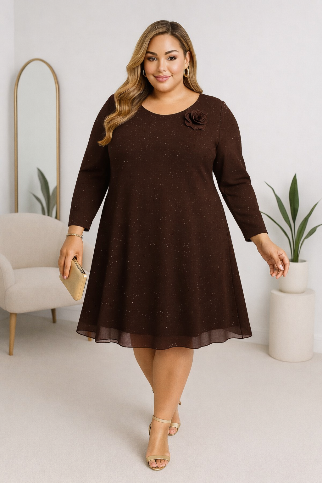 Kobieca, lekko rozkloszowana sukienka plus size, idealna na eleganckie wyjścia: wesele, chrzciny, komunię, święta czy wieczorne kolacje. Tkanina delikatnie połyskuje (nakrapiany lekko materiał ), a półtransparentne rękawy zakończone gumeczką i ozdobna róża przy dekolcie dodają szyku. Krój A pięknie układa się na sylwetce, miękko opływa brzuch i biodra, zapewniając komfort i swobodę.