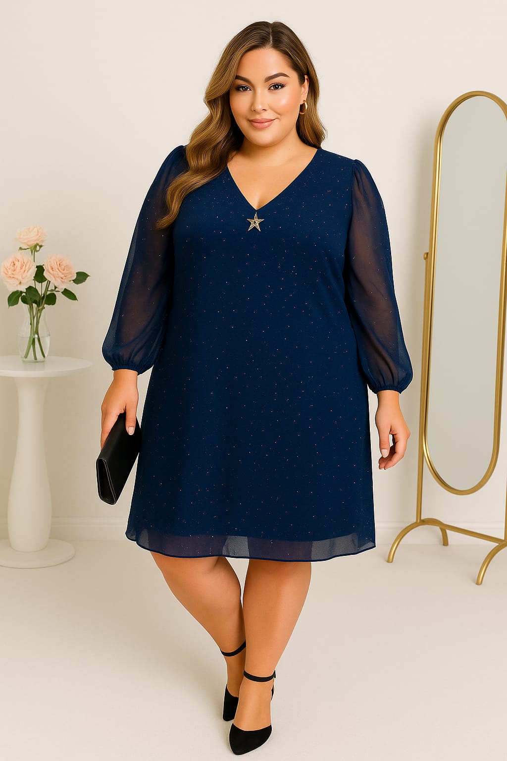 Kobieca, lekko rozkloszowana sukienka plus size, idealna na eleganckie wyjścia: wesele, chrzciny, komunię, święta czy wieczorne kolacje. Tkanina delikatnie połyskuje (nakrapiany lekko materiał ), a półtransparentne rękawy zakończone gumeczką. Krój A pięknie układa się na sylwetce, miękko opływa brzuch i biodra, zapewniając komfort i swobodę.