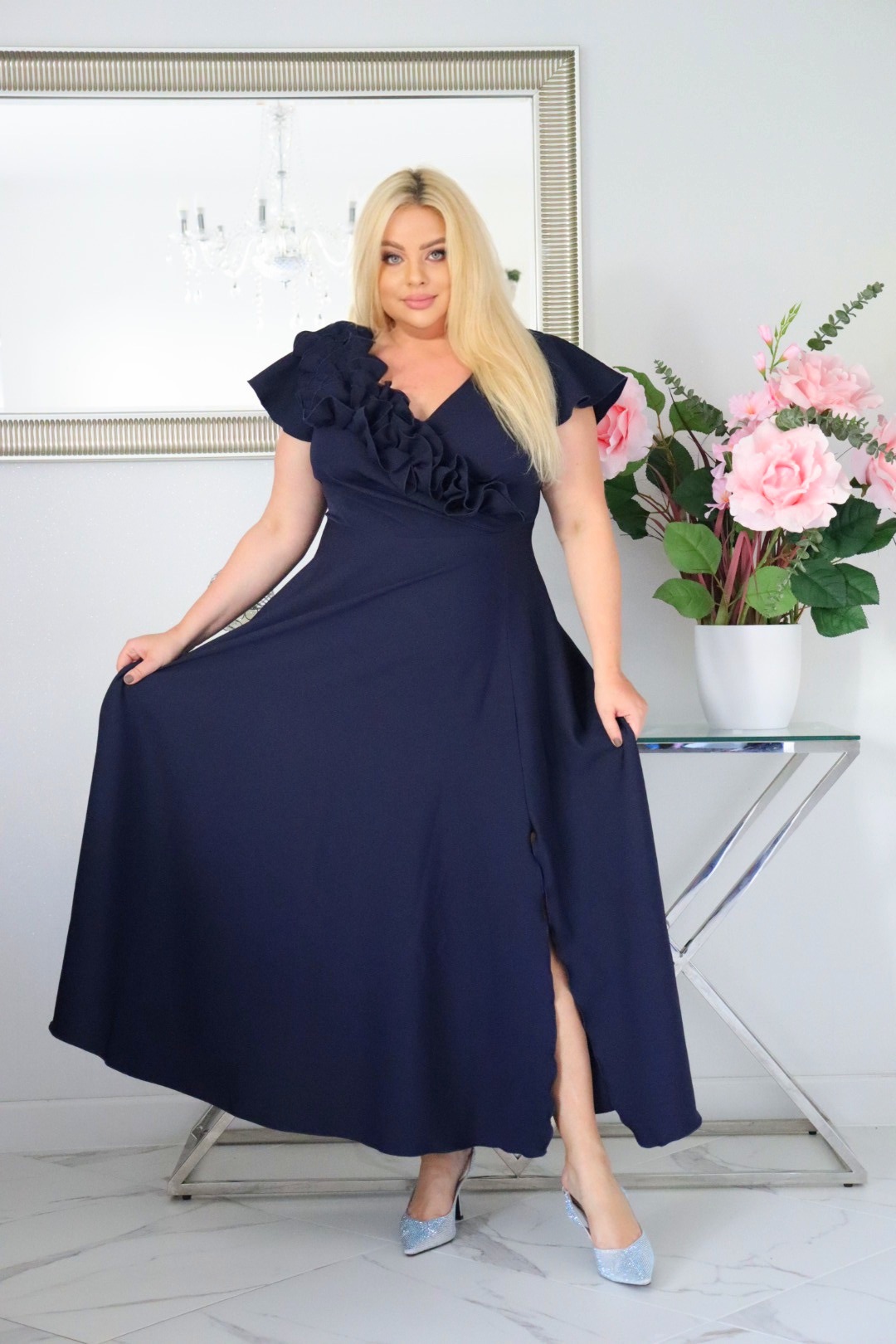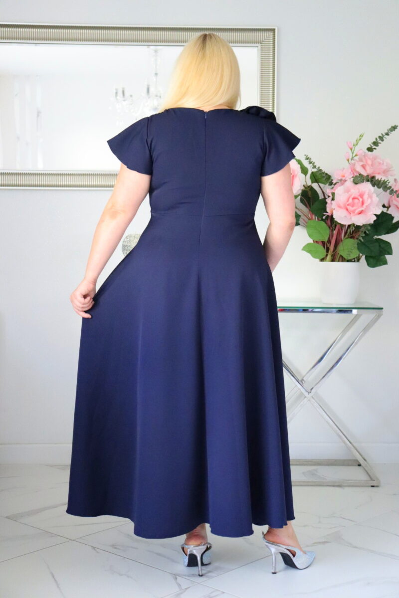Największym atutem sukienki jest efektowna, ręcznie naszywana falbana w formie rozkwitającego kwiatu, która nadaje kreacji luksusowy, butikowy charakter. To detal, który przyciąga spojrzenia i wyróżnia model na tle klasycznych sukienek okolicznościowych.