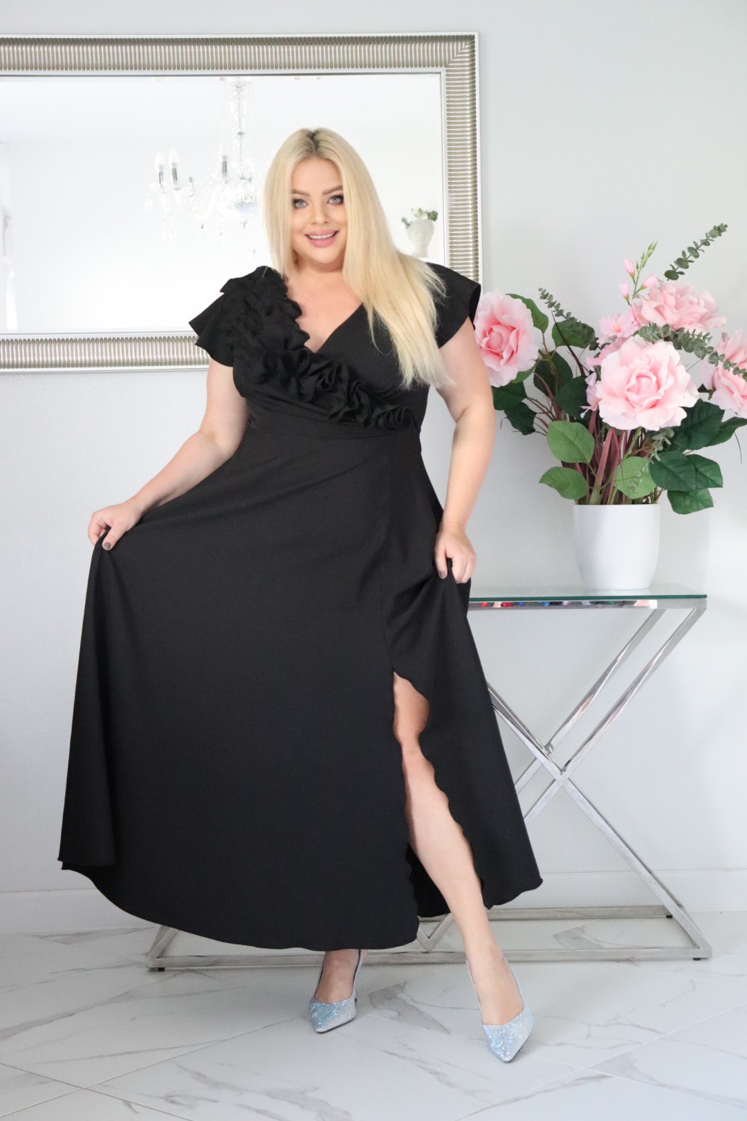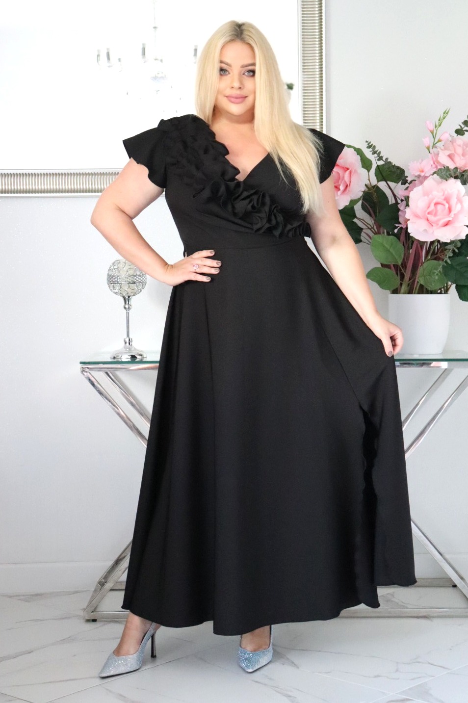 Największym atutem sukienki jest efektowna, ręcznie naszywana falbana w formie rozkwitającego kwiatu, która nadaje kreacji luksusowy, butikowy charakter. To detal, który przyciąga spojrzenia i wyróżnia model na tle klasycznych sukienek okolicznościowych.