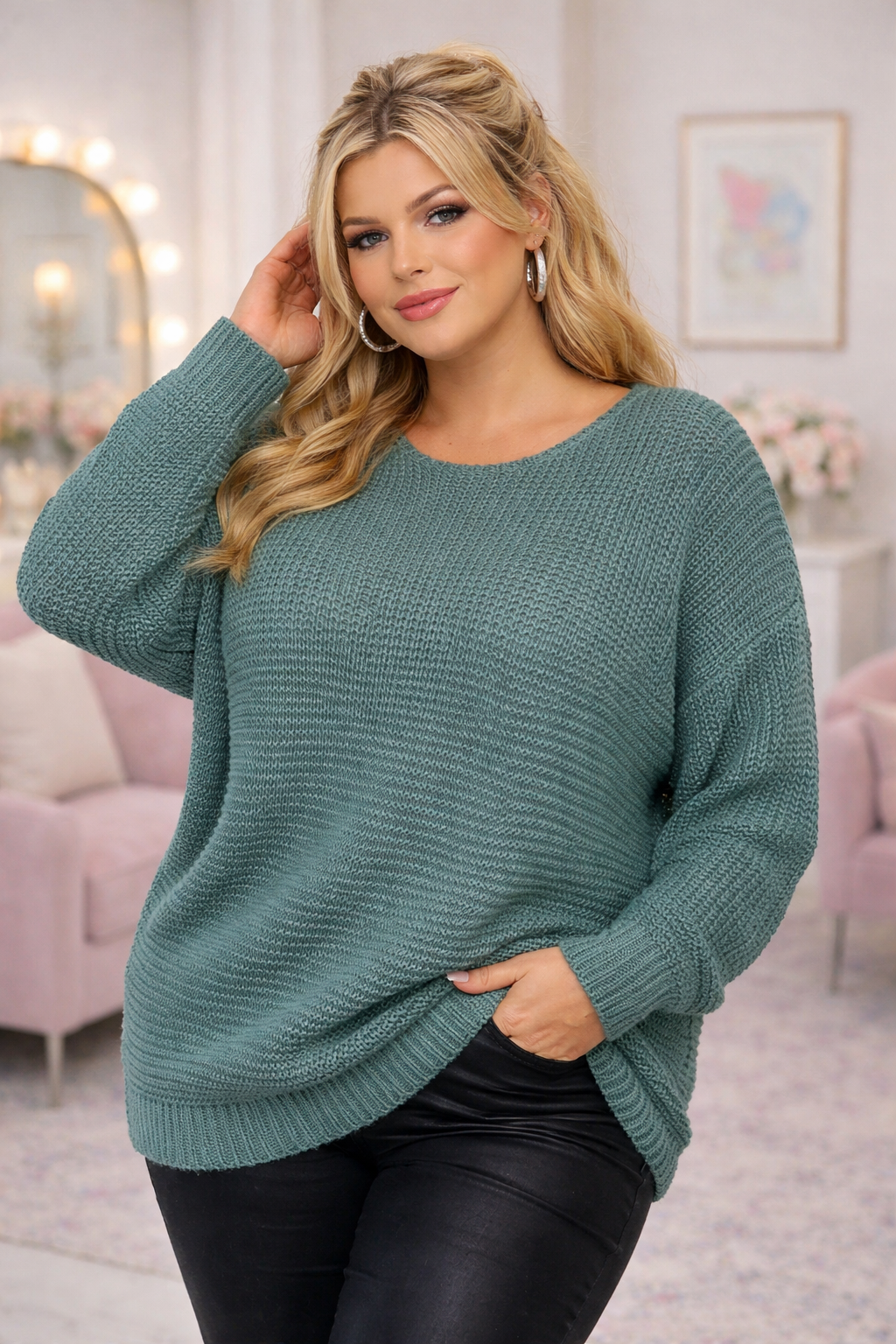 Ten sweter to absolutny must-have w szafie każdej kobiety plus size. Klasyczny fason sprawia, że wygląda niezwykle kobieco, a jednocześnie jest maksymalnie uniwersalny – idealny zarówno do codziennych stylizacji, jak i bardziej eleganckich zestawów.